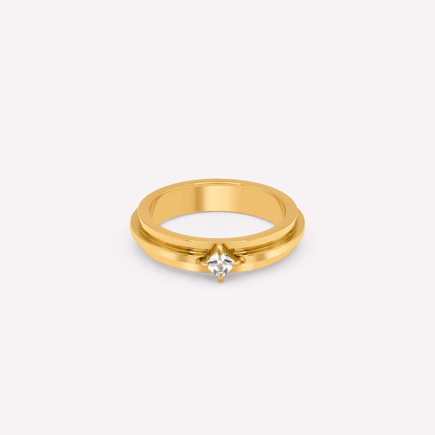 The Celeste Band features a sharp princess-cut stone set into a sleek gold band. Raised edges add subtle dimension, giving it the look of a stacked ring without the bulk.