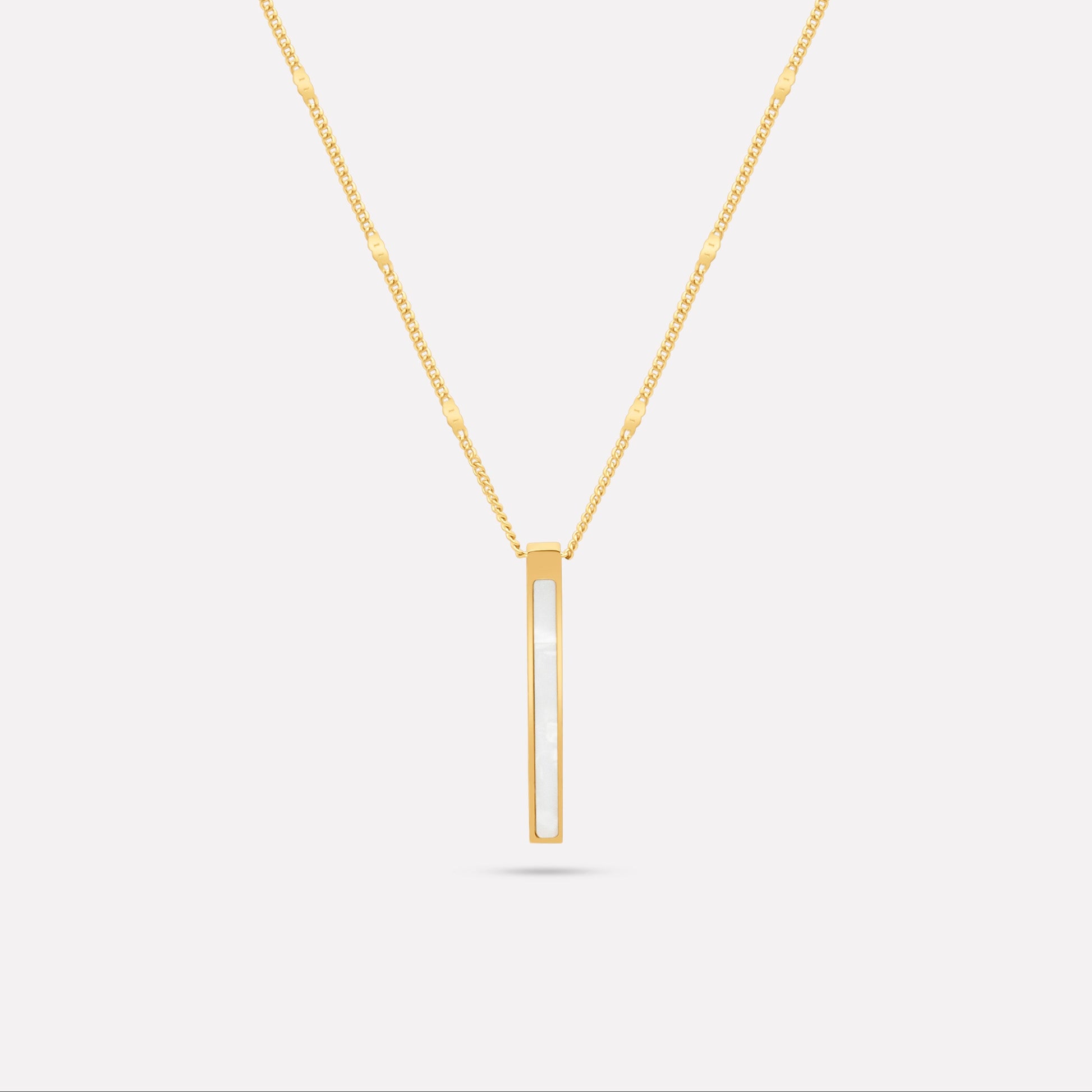The Lina Necklace features a sleek vertical pendant with a subtle shell inlay. Wear it solo for a refined look or layer it. Simple, but never boring.